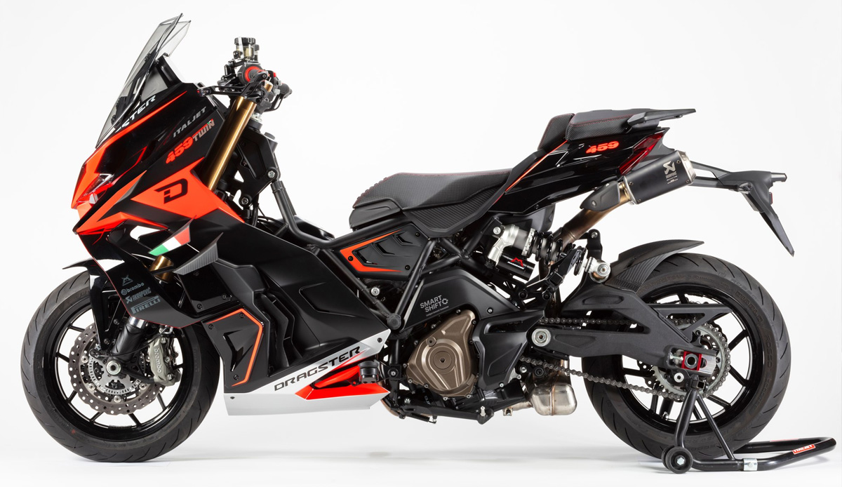 Dragster linija oduvijek se isticala nekonvencionalnim izgledom, a model 459 taj identitet dodatno naglašava. Izloženi cjevasti okvir, oštre linije i sportska silueta daju mu izgled pravog streetfightera na dva kotača. Ovo nije skuter koji se pokušava uklopiti – on se ističe.